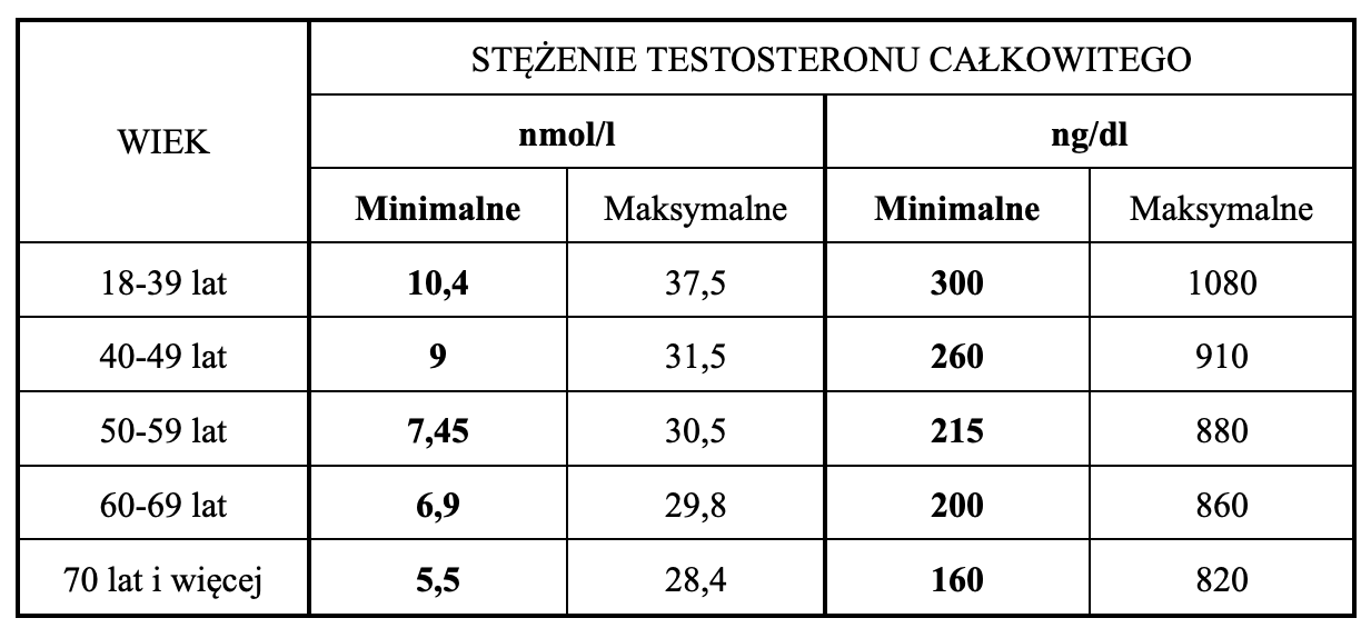 Poziom testosteronu osiąga szczyt w wieku 18-25 lat, a następnie spada o ok. 1-2% rocznie od 30. roku życia. Dlatego coraz więcej ekspertów podaje odmienne normy poziomu testosteronu całkowitego w zależności od wieku.